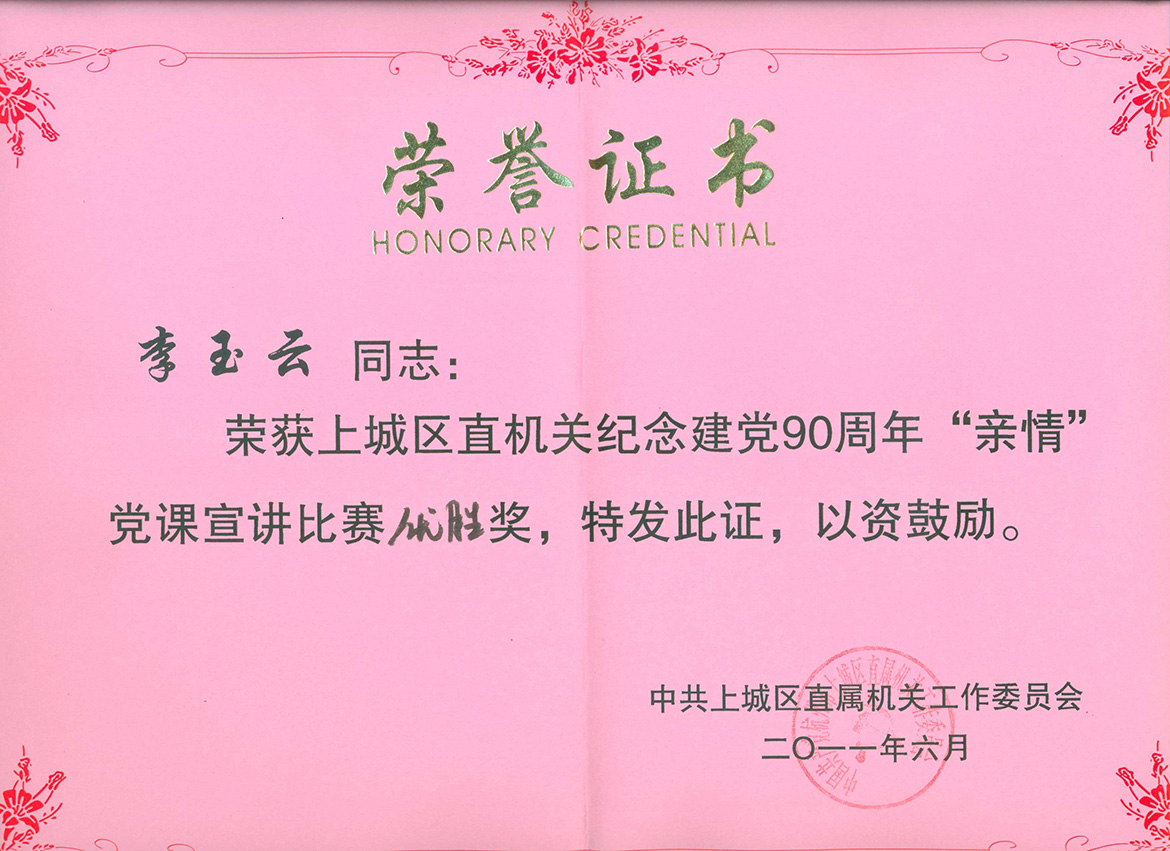 一、參加上城區(qū)直機(jī)關(guān)紀(jì)念建黨90周年“親情”黨課演講比賽,李玉云同志喜獲三等獎