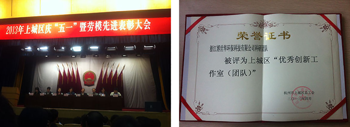 2013年4月26日,在2013年上城區(qū)慶“五一”暨勞模先進(jìn)表彰大會上,浙江博世華環(huán)??萍加邢薰究蒲袌F(tuán)隊,經(jīng)申報評議,被上城區(qū)總工會授予“上城區(qū)優(yōu)秀創(chuàng)新團(tuán)隊”榮譽(yù)稱號。