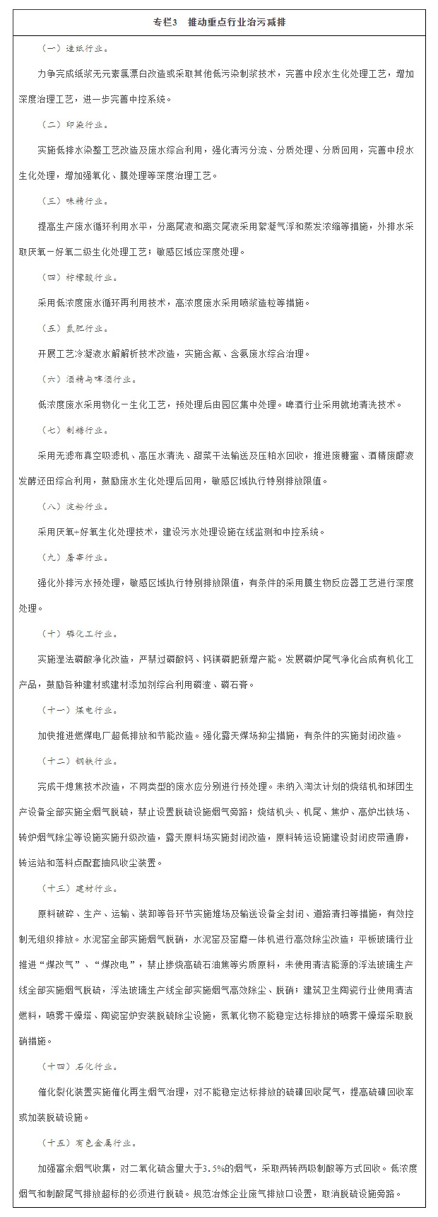 推動治污減排工程建設(shè)。各?。▍^(qū)、市)要制定實(shí)施造紙、印染等十大重點(diǎn)涉水行業(yè)專項(xiàng)治理方案,大幅降低污染物排放強(qiáng)度。電力、鋼鐵、紡織、造紙、石油石化、化工、食品發(fā)酵等高耗水行業(yè)達(dá)到先進(jìn)定額標(biāo)準(zhǔn)。以燃煤電廠超低排放改造為重點(diǎn),對電力、鋼鐵、建材、石化、有色金屬等重點(diǎn)行業(yè),實(shí)施綜合治理,對二氧化硫、氮氧化物、煙粉塵以及重金屬等多污染物實(shí)施協(xié)同控制。各?。▍^(qū)、市)應(yīng)于2017年底前制定專項(xiàng)治理方案并向社會公開,對治理不到位的工程項(xiàng)目要公開曝光。制定分行業(yè)治污技術(shù)政策,培育示范企業(yè)和示范工程。