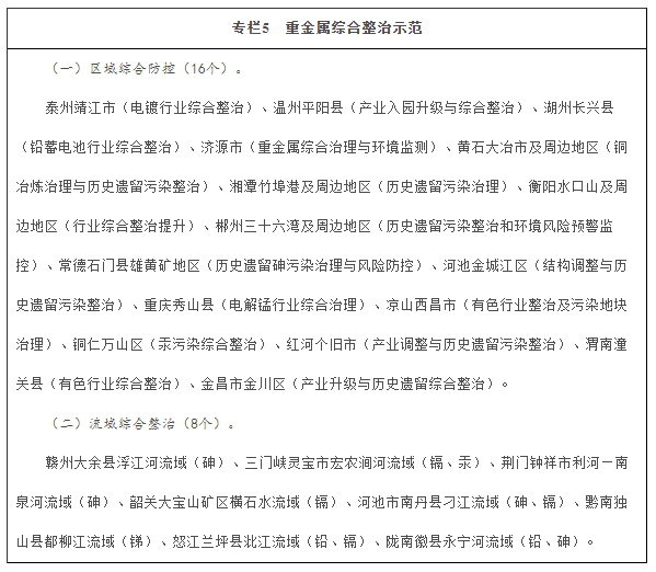 深化重點(diǎn)區(qū)域分類防控。重金屬污染防控重點(diǎn)區(qū)域制定實(shí)施重金屬污染綜合防治規(guī)劃,有效防控環(huán)境風(fēng)險和改善區(qū)域環(huán)境質(zhì)量,分區(qū)指導(dǎo)、一區(qū)一策,實(shí)施差別化防控管理,加快湘江等流域、區(qū)域突出問題綜合整治,“十三五”期間,爭取20個左右地區(qū)退出重點(diǎn)區(qū)域。在江蘇靖江市、浙江平陽縣等16個重點(diǎn)區(qū)域和江西大余縣浮江河流域等8個流域開展重金屬污染綜合整治示范,探索建立區(qū)域和流域重金屬污染治理與風(fēng)險防控的技術(shù)和管理體系。建立“錳三角”(錳礦開采和生產(chǎn)過程中存在嚴(yán)重環(huán)境污染問題的重慶市秀山縣、湖南省花垣縣、貴州省松桃縣三個縣)綜合防控協(xié)調(diào)機(jī)制,統(tǒng)一制定綜合整治規(guī)劃。優(yōu)化調(diào)整重點(diǎn)區(qū)域環(huán)境質(zhì)量監(jiān)測點(diǎn)位,2018年底前建成全國重金屬環(huán)境監(jiān)測體系。