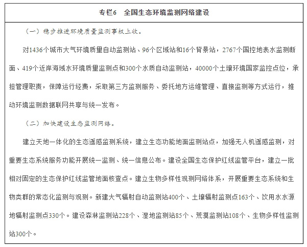 加強(qiáng)生態(tài)環(huán)境監(jiān)測網(wǎng)絡(luò)建設(shè)。統(tǒng)一規(guī)劃、優(yōu)化環(huán)境質(zhì)量監(jiān)測點(diǎn)位,建設(shè)涵蓋大氣、水、土壤、噪聲、輻射等要素,布局合理、功能完善的全國環(huán)境質(zhì)量監(jiān)測網(wǎng)絡(luò),實(shí)現(xiàn)生態(tài)環(huán)境監(jiān)測信息集成共享。大氣、地表水環(huán)境質(zhì)量監(jiān)測點(diǎn)位總體覆蓋80%左右的區(qū)縣,人口密集的區(qū)縣實(shí)現(xiàn)全覆蓋,土壤環(huán)境質(zhì)量監(jiān)測點(diǎn)位實(shí)現(xiàn)全覆蓋。提高大氣環(huán)境質(zhì)量預(yù)報和污染預(yù)警水平,強(qiáng)化污染源追蹤與解析,地級及以上城市開展大氣環(huán)境質(zhì)量預(yù)報。建設(shè)國家水質(zhì)監(jiān)測預(yù)警平臺。加強(qiáng)飲用水水源和土壤中持久性、生物富集性以及對人體健康危害大的污染物監(jiān)測。加強(qiáng)重點(diǎn)流域城鎮(zhèn)集中式飲用水水源水質(zhì)、水體放射性監(jiān)測和預(yù)警。建立天地一體化的生態(tài)遙感監(jiān)測系統(tǒng),實(shí)現(xiàn)環(huán)境衛(wèi)星組網(wǎng)運(yùn)行,加強(qiáng)無人機(jī)遙感監(jiān)測和地面生態(tài)監(jiān)測。構(gòu)建生物多樣性觀測網(wǎng)絡(luò)。