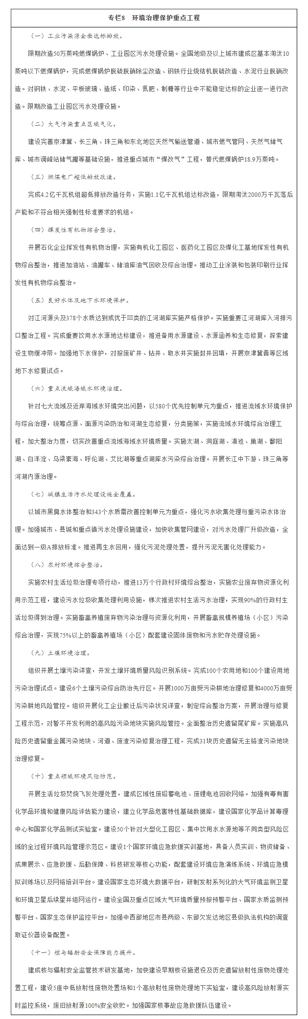 “十三五”期間,國家組織實(shí)施工業(yè)污染源全面達(dá)標(biāo)排放等25項(xiàng)重點(diǎn)工程,建立重大項(xiàng)目庫,強(qiáng)化項(xiàng)目績效管理。項(xiàng)目投入以企業(yè)和地方政府為主,中央財政予以適當(dāng)支持。