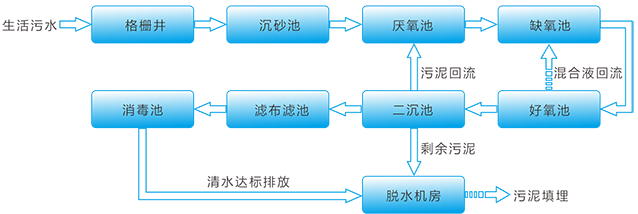“格柵+沉砂池+改良型A2/O+二沉池+濾布濾池+紫外線消毒”工藝:進水中漂浮物及粗大顆粒物被格柵攔截,然后進入沉砂池,去除其中砂粒,防止其在后續(xù)構(gòu)筑物中沉積,出水進入整個污水處理部分的核心部分改良型A2/O系統(tǒng),污水從厭氧池進入生化處理系統(tǒng),依次流經(jīng)厭氧池、缺氧池、好氧池,同時混合液回流至缺氧池,出水排至二沉池,泥水分離,污泥回流至生化系統(tǒng),污水進入濾布濾池,過濾后出水進入紫外線消毒池,達(dá)標(biāo)后排放。