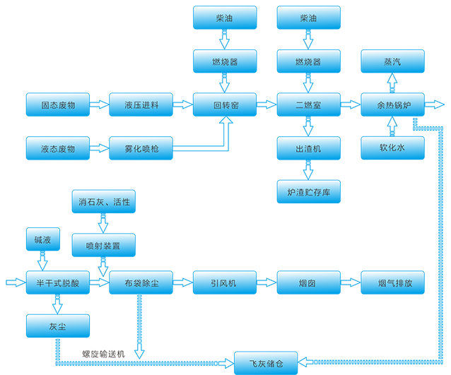 主要焚燒設(shè)備:回轉(zhuǎn)窯+二燃室+余熱鍋爐+尾氣處理設(shè)備;